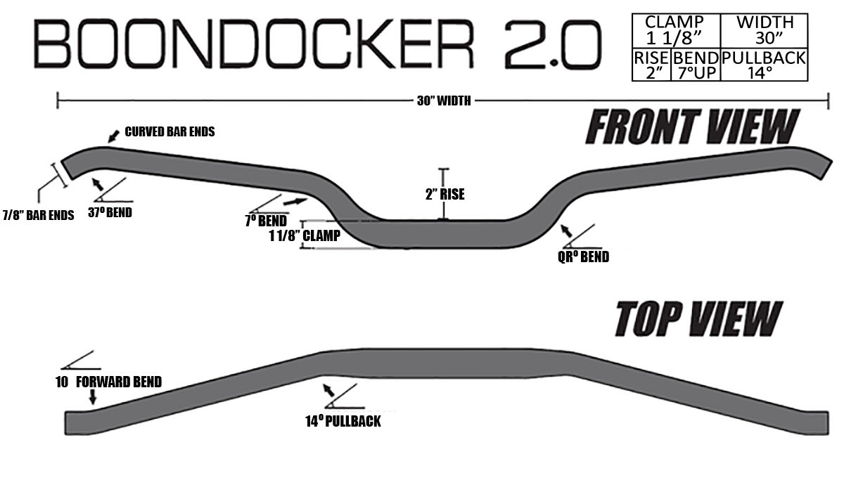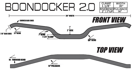 THE BOONDOCKER 2.0 IS AN OVERSIZED HANDLEBAR, MEASURING 1 1/8" AT THE CLAMPING AREA. VERIFYING FIT IS YOUR RESPONSIBILITY.