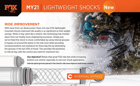 With input from our Backcountry Team, including Dave McClure, the new FOX lightweight mountain shocks improved ride quality is as significant as their weight savings. This technology has trickled down from our trophy truck engineering successes. Simply put, we’ve freed the shock to move comfortably by using internal grooves to bypass oil around the piston in the ride zone while providing increased bottom-out resistance for those big hits by eliminating the grooves in the last 30% of travel. This provides the plushness to ride all day with the control you need for maximum fun. Our objective? Retain that great FOX ride feel while increasing bottom-out control, especially in coil-over shock applications.