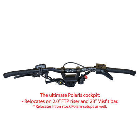 Our Polaris Relocates are designed to be used in conjunction with our new FTP risers, but they can be used on any stock Polaris sled with a flat top steering post. Remove your reverse button and kill switch from your bars for the cleanest look. Parts are CNC machined from strong yet light 6061-T06 aluminum and anodized black and tumble finished. The graphics are laser etched for a clean & durable look. Sold as a pair