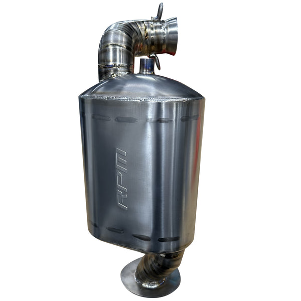 The RPM Q-Muf is a high performing, free flowing, mechanically chambered QUIET muffler. Only slightly louder than factory while providing HUGE gains in the performance and weight department. These mufflers are deigned by utilizing a series of pass though baffles and chambers to deaden sound while still allowing enough CFM & exhaust velocity through the whole system to not suffer ANY power loss while increasing throttle responsiveness! At WOT our mufflers are designed to load the chambers with exhaust flow and overflow CFM to the pass through chambers which will allow exhaust to more freely flow through when needed. With the throttle closed and drastically less exhaust flow, the exhaust will then return to flowing through the baffles and mechanical chambers providing a deep quiet sound. Our uniquely designed oval domed top and bottom muffler body's eliminate any hot spots or fume dead spots providing a smooth free flowing path of exhaust gasses. The mufflers internals are fully welded to provide absolute most durable construction. We did not skimp on ANY material including the fact that our mufflers have a snow plate which not only keeps snow out of the tunnel but FUMES out as well! The snow plate blocks fumes from being able to enter when the exit tip of the muffler is fully submerged in snow or taking snow impacts to the belly pan. The mufflers exit tip is also DUAL wall titanium allowing us to protrude the tip further than the competitors while still remaining worry free of dents, bends, or damage. All of our mounts are "over built" in order to never leave you frustrated & out of commission from lack of support or weak mounts. All of our chambered snowmobile mufflers are backed by a 3 year manufactures warranty.