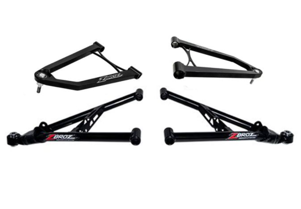 Kit includes Billet Upper Arms and Chromoly Lower A-arms, Ball Joints and Bushings and Billet Tie Rods. Model Years 2016-2018 require new shocks to fit the narrow 36” front end length.