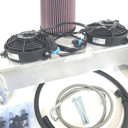 5. Large Aluminum Intercooler: With a sizeable 2.5"x6"x20" intercooler boasting CNC Billet aluminum end tanks, our kit ensures that your engine breathes cool air, resulting in maximum performance. We've also added a billet CNC'd intercooler fan mount, equipped to handle two 6" SPAL fans for enhanced cooling.