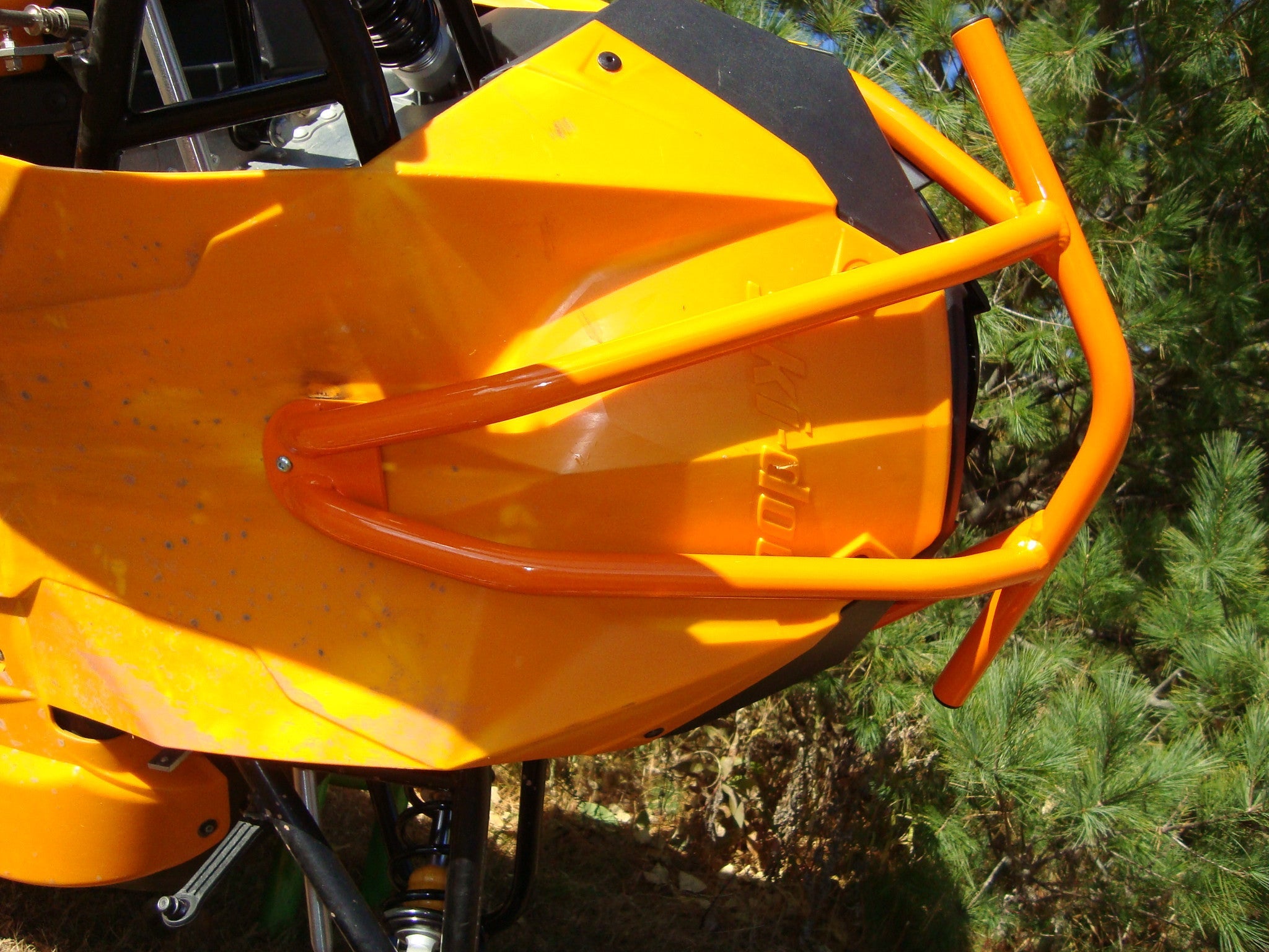 This is our EXO front bumper for the SkiDoo XM. If you have broken the factory mounting tabs off your overstructure, you're in luck! By bolting the bumper to the overstructure we eliminated the need for the factory tabs. This increases strength of the bumper. We also added lower tubes that tie into BRACING SUPPLIED BY CUSTOMER.